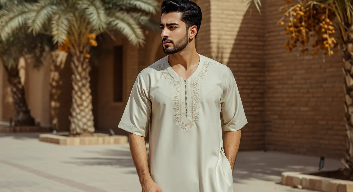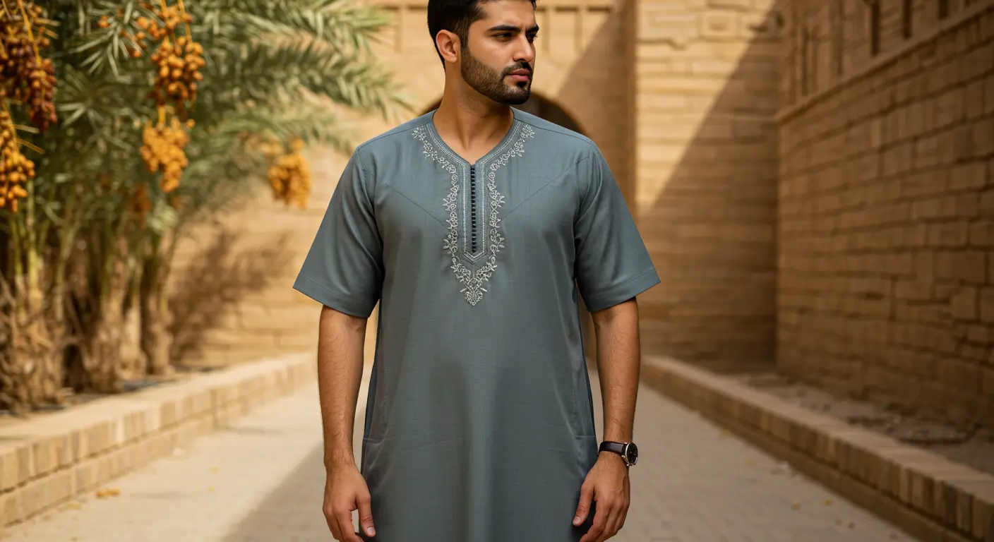 Arabic Embroidered Half Sleeves Jalabiya for Men – Lightweight Comfort for Hot Weather